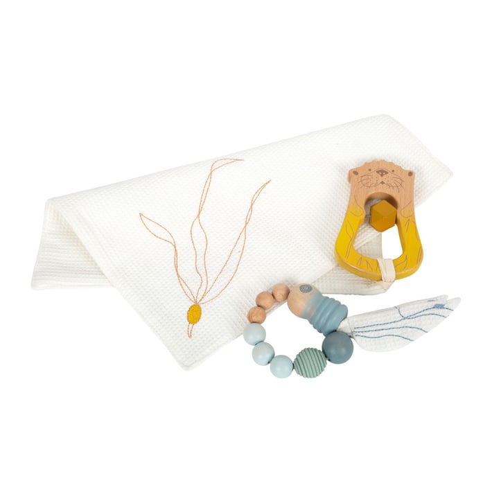 Видрата е играчка и дрънкалка в едно. Тя очарова мъниците с деликатни и приятни звуци, а памучната кърпа за бебета може да послужи като одеяло или кърпа и може да бъде прикрепено към дрънкалката или детската количка.