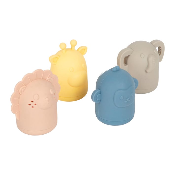 - 4 играчки за баня, изработени от мек, BPA-free силикон: лъв, слон, жираф и маймунка.