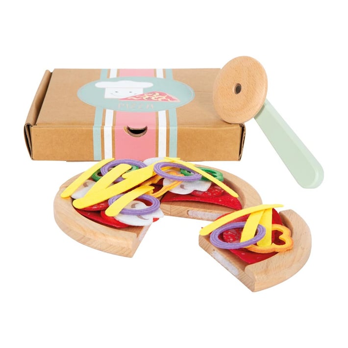 Време е за пица! Този здрав дървен комплект приканва децата да създават, режат и сервират собствена пица. Парчетата с велкро, двустранният доматен сос от филц и истинското ролково ножче правят въображаемото готвене напълно реалистично.