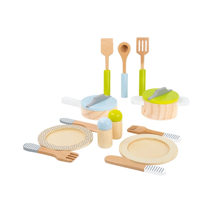 На вниманието на всички топ готвачи! Готвенето за гости е много забавно с този комплект от съдове и прибори, изработени от здрава дървесина. Подвижните капаци за съдове се захващат лесно. Ето как детската кухня може за миг да се превърне в кухня на топ готвач, като същевременно тренира социалните умения и използването на прибори за хранене!