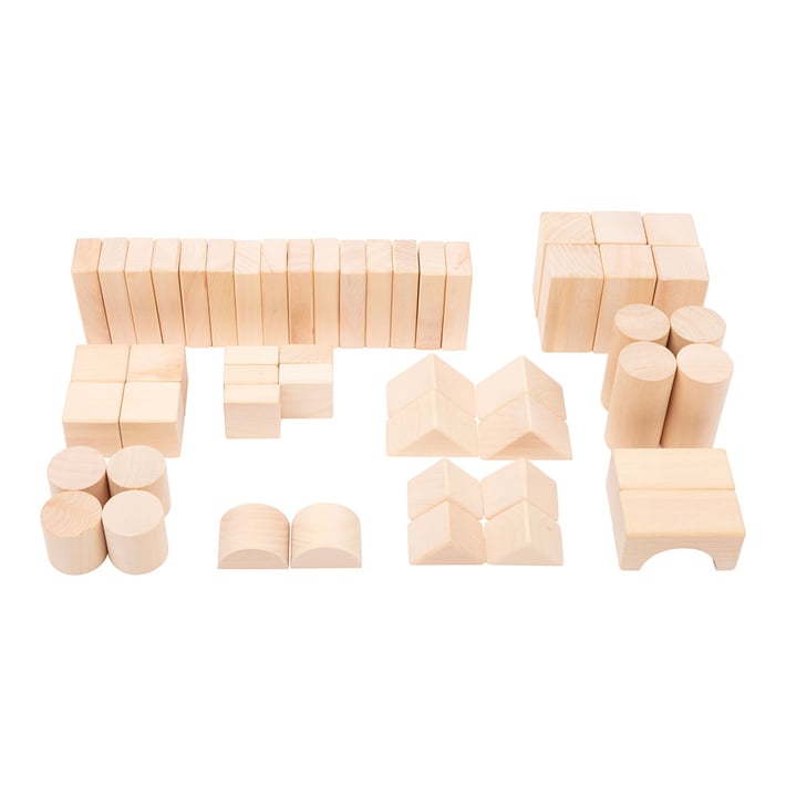 Комплектът съдържа 50 строителни дървени блокчета, изработени от дърво. Децата ще изградят своите архитектурни шедьоври, благодарение на различно оформените строителни блокчета в класически дизайн.