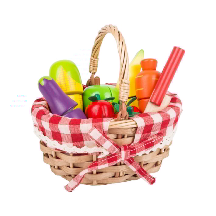 Пазарска кошница, в която има ягоди, морков, патладжан, кочани царевица, ябълка и банан. С включения дървен нож храната може да бъде разрязана на парчета. По този начин, освен забавлението при игра, се насърчават и двигателните умения в децата! Това позволява на децата да пазаруват хранителни стоки точно като възрастните и да развиват социалните си умения. Всички „покупки“ могат да се носят вкъщи в дървената кошница с дръжката за носене.