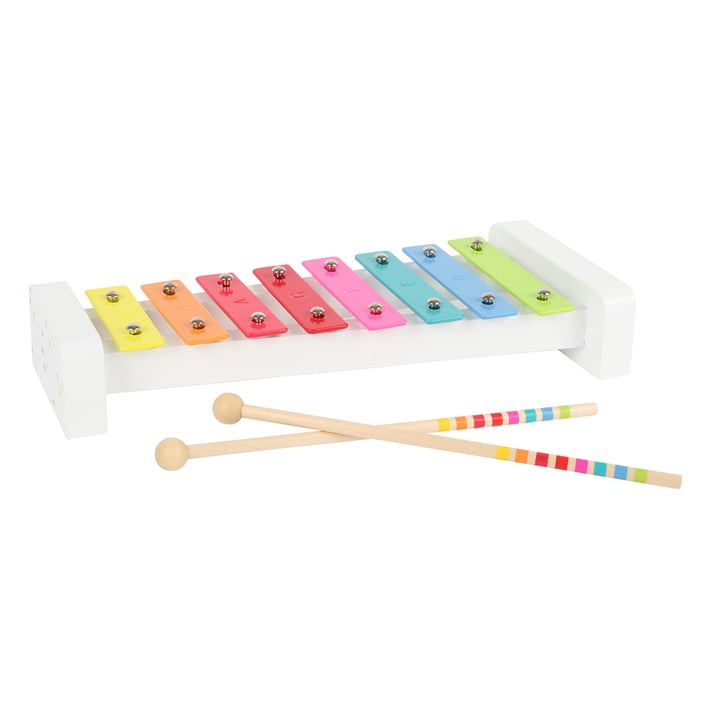 . Ксилофонът идва с нотен лист за научаване на музикално произведение, при което нотите и съответните ленти са маркирани в еднакви цветове. Удряйки отделните клавиши с клапъра, младите музиканти ще тренират слуховото си възприятие. Цветен музикален инструмент за момчета и момичета.