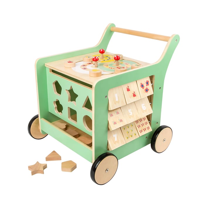 Бебешката проходилка, изработена от FSC® 100% сертифицирана дървесина, е абсолютно мултифункционална, благодарение на своите функции и минималистичния си дизайн. Детето ви ще може да я върти, да поставя части и да я бута. Горната дъска може да бъде повдигната нагоре и вътре да съхранявате много играчки. Спирачната система осигурява стабилно положение по време на игра, когато детето не бута количката.