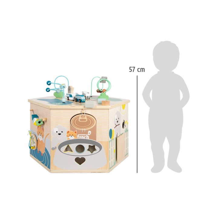Този куб за активности от 8 страни предлага дълготрайно забавление и дава знания за това какъв е животът с домашни любимци! Децата ще тренират двигателните си умения в плъзгащия се лабиринт, играта за приспособяване на формата, с въртящите се плочки или с предизвикателството да сортиране на цветове - всички визуално свързани с любимите животни!