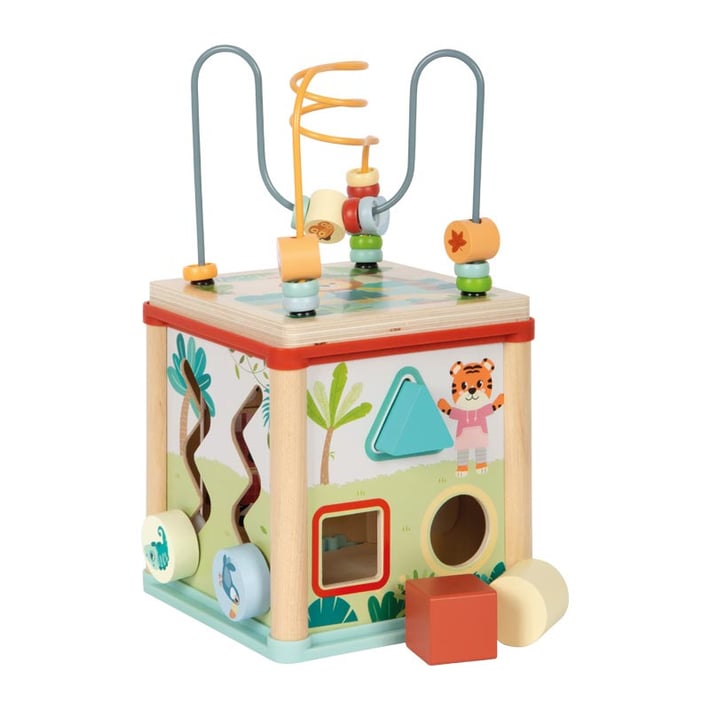 Пет активни страни осигуряват разнообразие в компактен формат: лабиринт с мъниста, сортер за форми, зъбни колела, плъзгащ лабиринт и въртящи се плочки. Капакът се обръща и се прибира вътре в кубчето, за да пести място между игрите.