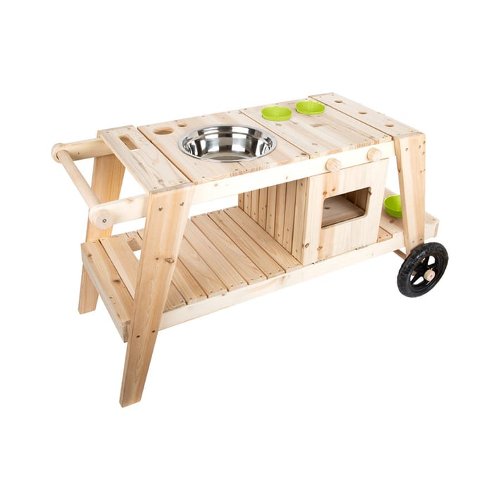 Пясък + вода = кал и забавление! Тази модерно проектирана кухня, изработена от устойчива на атмосферни влияния дървесина е новата звезда на двора и на балкона! Може да се играе от четирите й страни и предлага място за няколко деца за творческа игра като кухня на открито. Фурна с две копчета, които издават щракащи звуци, голяма купа, две малки керамични саксии и две саксии от метал, както и вдлъбнатини, куки и повърхност за съхранение и организиране на градински инструменти, оборудване за готвене и прибори правят тази изключителна ''лятна кухня'' завършена!