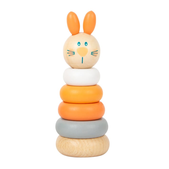 Много забавления за малки ръчички! Заекът и неговият приятел мечката вдъхновяват малките деца да сортират различно оцветените пръстени по размер и да ги подреждат един върху друг в правилния ред.С тази играчка децата могат да тренират фините си двигателни умения по напълно забавен начин.Частите са изработени от 100% сертифицирана FSC® дървесина.Размери: 13 x ø 5 cm.За деца над 1 година.