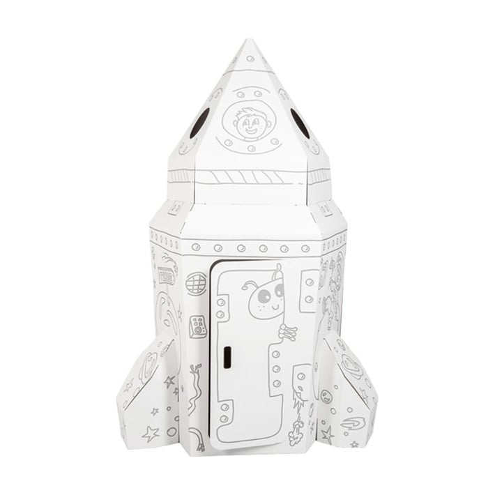 Пътуване до луната или поне пътуване през детската стая обещава тази страхотна къща за игра във формата на ракета. Люковете са перфорирани и могат да бъдат лесно продупчени. Отворът към пилотската кабина може да се отвори.