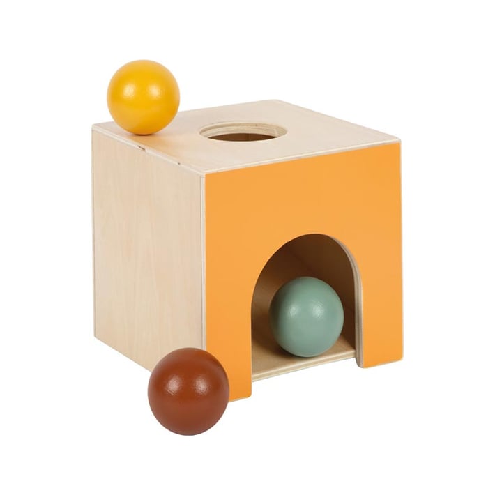 Класическата Монтеcори кутия с топчета е истинска икона в ранното обучение: тя запознава бебетата от около 6-месечна възраст с концепцията за постоянство на обекта по забавен и интерактивен начин. Това завладяващо занимание мотивира децата отново и отново да хващат, пускат и съсредоточават вниманието си. Така се стимулират важни етапи в развитието – целенасочено хващане, контролирано пускане, развитие на грубата моторика и координацията око–ръка. Едновременно с това детето осъзнава, че даден предмет не изчезва, дори когато временно не го вижда – фундаментално разбиране през първите месеци от живота. Кутията с топчета насърчава и допълнителни експерименти – например пускане на други предмети през отвора, за да се наблюдава как се търкалят.