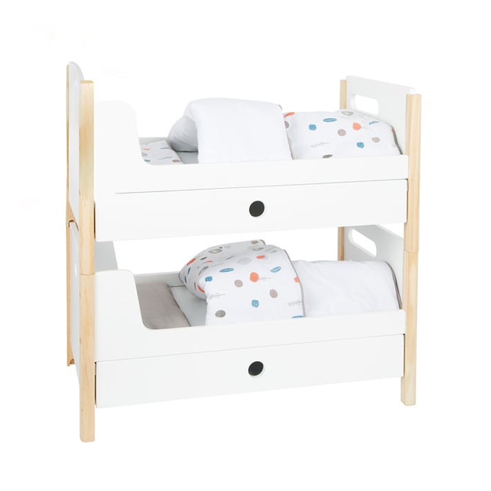 Това двуетажно легло прави впечатление със своята функционалност и дизайн, който ще се впише идеално във всяка зона за детска игра. Модерното, двустранно, неутрално по отношение на пола спално бельо и огромните одеяла позволяват на куклите и плюшените играчки да „спят“ особено комфортно в двете малки легла, разположени индивидуално или подредени едно върху друго. Свързването на двете единични легла създава стълба за горното легло в долния край на леглата. Обособените чекмеджета са идеални за съхранение на аксесоари за кукли.