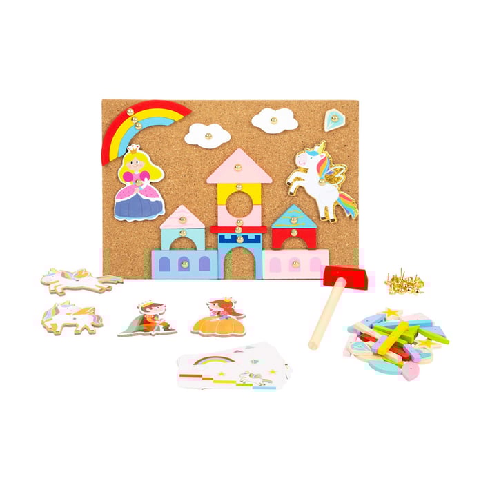 Оборудван комплект с коркова дъска, два малки дървени чука, 100 малки пирона и 126 цветни дървени парчета ви дават начален сигнал за създаване на ваша собствена индивидуална картина.