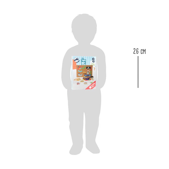 Класическа игра с богат избор от малки дървени плочки и елементи с мотиви от темата за пиратите. С чукчето могат да бъдат изковани различни пиратски мотиви върху корковата дъска. Четирите карти предлагат идеи на малките творци. Нищо не се губи благодарение на практичната кутия за съхранение.