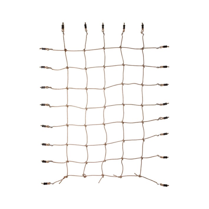 Няма ограничения за забавлението с тази здрава мрежа за катерене с естествен вид на въже. Предлага се с ръчно завързани възли, отворени примки и стабилни куки за лесно и гъвкаво монтиране върху дървени рамки и катерушки.