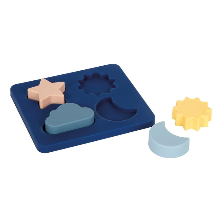 Първи пъзел, подходящ за малки деца, изработен от мек, хранителен силикон. Със слънце, луна, облак и звезда, които могат да се поставят и отворени, и затворени, той насърчава любопитството, съчетаването и сетивното изследване — дори във ваната или пясъчника.