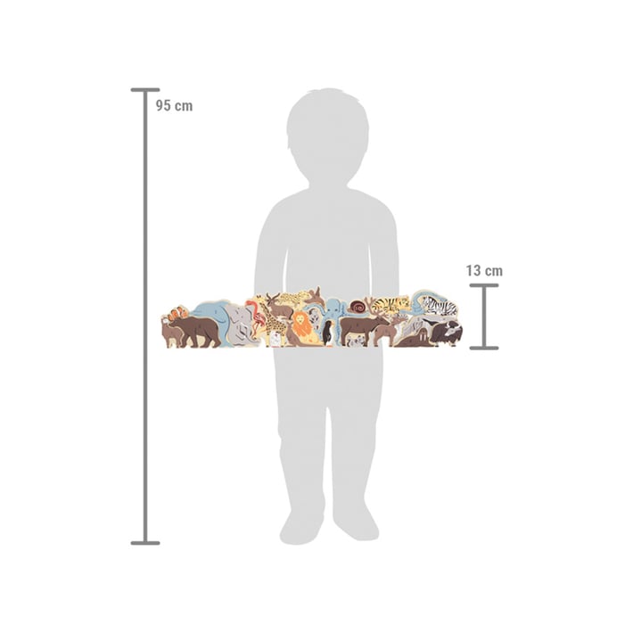Целта на този ярко оцветен пъзел е да съберете 26-те дървени фигурки на животни. Алпака, фламинго, пингвин и техните приятели са изработени от гладко дърво, което ги прави лесни за хващане от детските ръце и позволява да се играе с тях отделно от пъзела по време на изпълнена с фантазия игра. Върху животните е отпечатана първата буква от имената им на немски и английски, което помага за правилното подреждане на частите от пъзела. Това е диво забавление с пъзел, което помага на децата да научат букви и имена на животни.