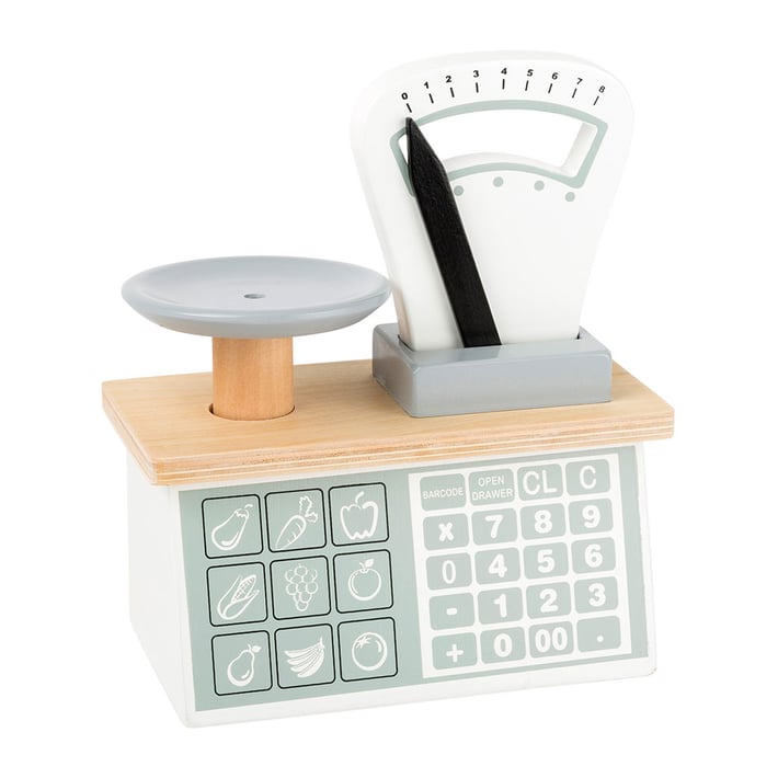 Детската везна е идеалният аксесоар за всеки магазин. Поставете плодове и зеленчуци върху везните и интегрираният пружинен механизъм ще премести показалеца си, за да покаже теглото. Играта с везната насърчава креативността на младите продавачи.