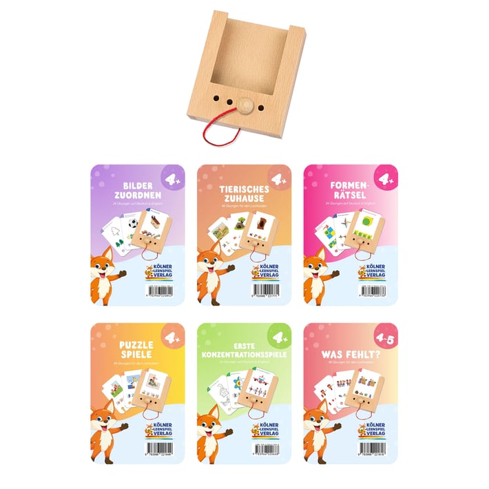 Шест комплекта образователни карти, подходящи за деца над 4 години. Един комплект карти съдържа 24 двустранни карти с общо 48 упражнения: