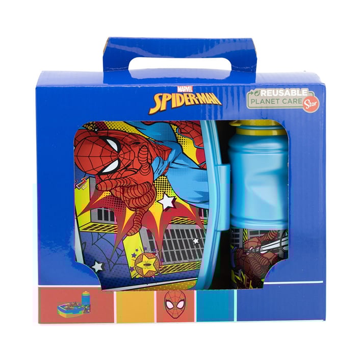 Комплект кутия за сандвичи и бутилка за многократна употреба „Спайдърмен“, които малките ни приятели могат да носят навсякъде - в парка, в училище или на екскурзия.