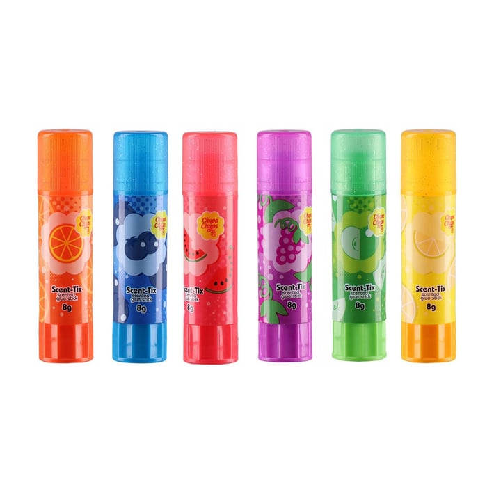 Лепило стик Scent Tix с аромат и атрактивен дизайн с брандиране Chupa Chups. Отличава се с ярки цветове и плодови мотиви, а модерната пластмасова опаковка привлича вниманието и го прави подходящо за училищни и сезонни асортименти. Стик формата позволява прецизно и лесно нанасяне върху хартия и картон.