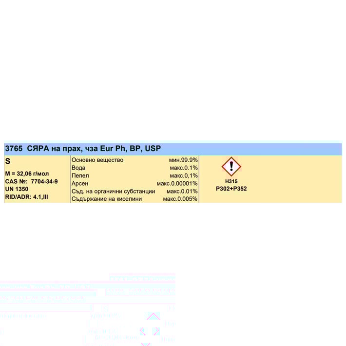 Сяра на прах (S) , чиста за анализ, Eur Ph, BP, USP.