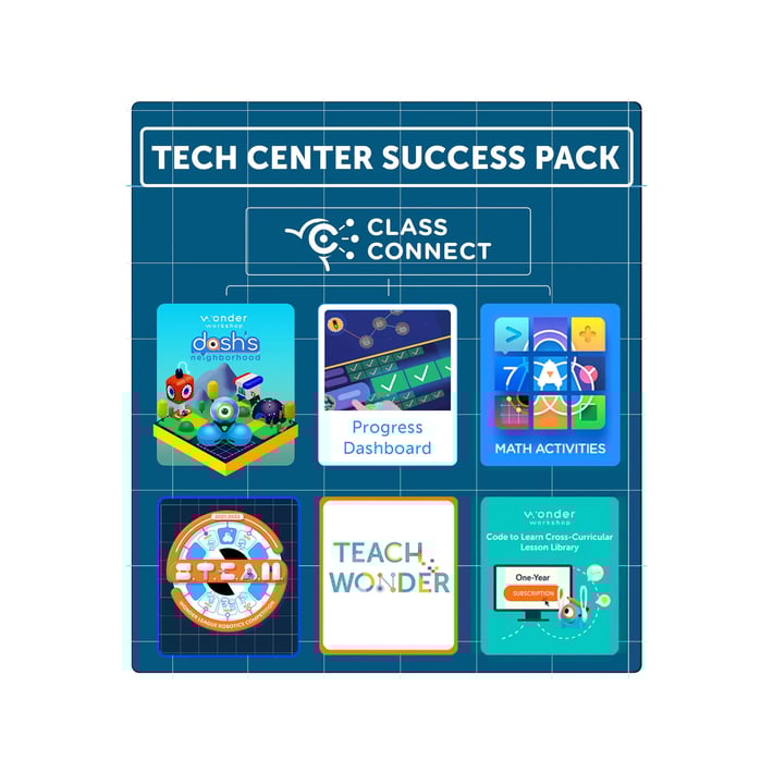 Tech Center Success включва лиценз за 1 учител и всички ученици в училище с програмата Class Connect, която позволява следене на напредъка на всеки ученик, както и достъп до 3-D средата за програмиране на виртуален Dash - Dash's Neighborhood.