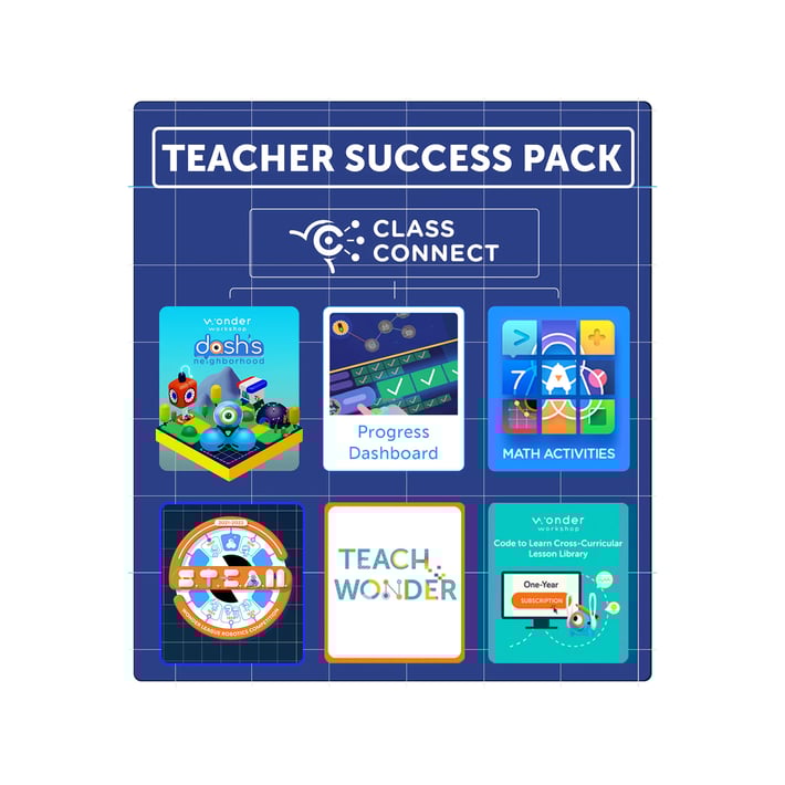 Teacher Success включва лиценз за 1 учител и до 35 ученика с програмата Class Connect, която позволява следене на напредъка на всеки ученик, както и достъп до 3-D средата за програмиране на виртуален Dash - Dash's Neighborhood.